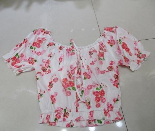 Blusa blanca con estampado de fresas rosas y verdes, perfecta para un look alegre y juvenil. Su diseño de escote cuadrado con tiras ajustables al frente y manga corta abullonada le da un toque femenino. El tejido elástico en la parte trasera garantiza un mejor ajuste.