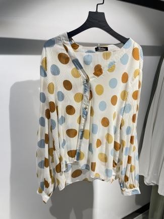 Llena de alegría y frescura, esta blusa combina la ligereza del tejido con un divertido estampado de puntos multicolor. Es una prenda versátil que puede usarse tanto en un look casual como en uno más elegante, según cómo se combine. Su diseño fluido aporta comodidad y movimiento, ideal para quienes disfrutan de un estilo desenfadado pero con encanto.