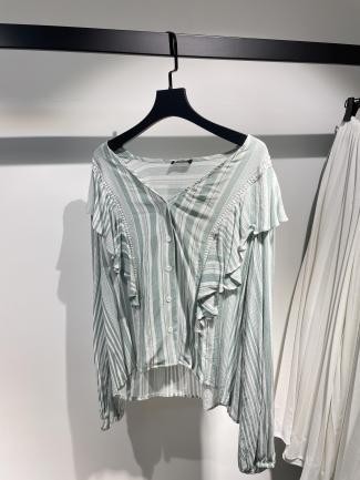 Blusa blanca con rayas celestes y volantes