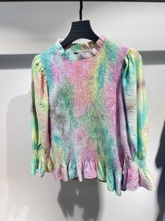 Blusa de colores pastel con efecto tie dye y volantes en el borde