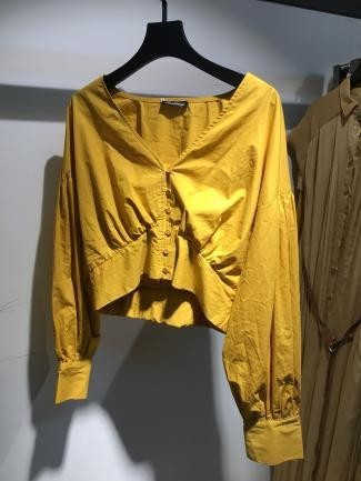 Blusa mostaza con volantes en el escote y manga tres cuartos