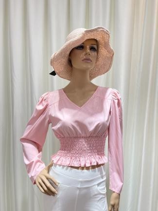 Femenina y romántica, esta blusa en tono rosado presenta mangas abullonadas y un diseño fruncido en la cintura que realza la figura. Perfecta para ocasiones casuales o looks delicados.