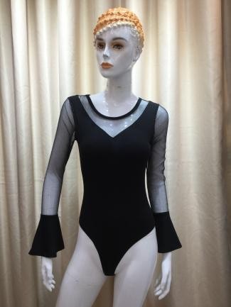De estilo moderno y elegante, este body negro presenta mangas acampanadas y paneles de malla que aportan un toque distintivo. Perfecto para un look de noche con personalidad y estilo.
