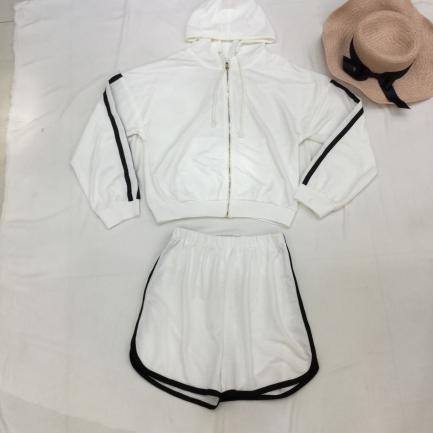 Este conjunto blanco combina la elegancia minimalista con un aire deportivo. El buzo con cierre y los pantalones cortos presentan líneas negras que aportan contraste y dinamismo. Perfecto para looks casuales con un toque limpio y moderno.
