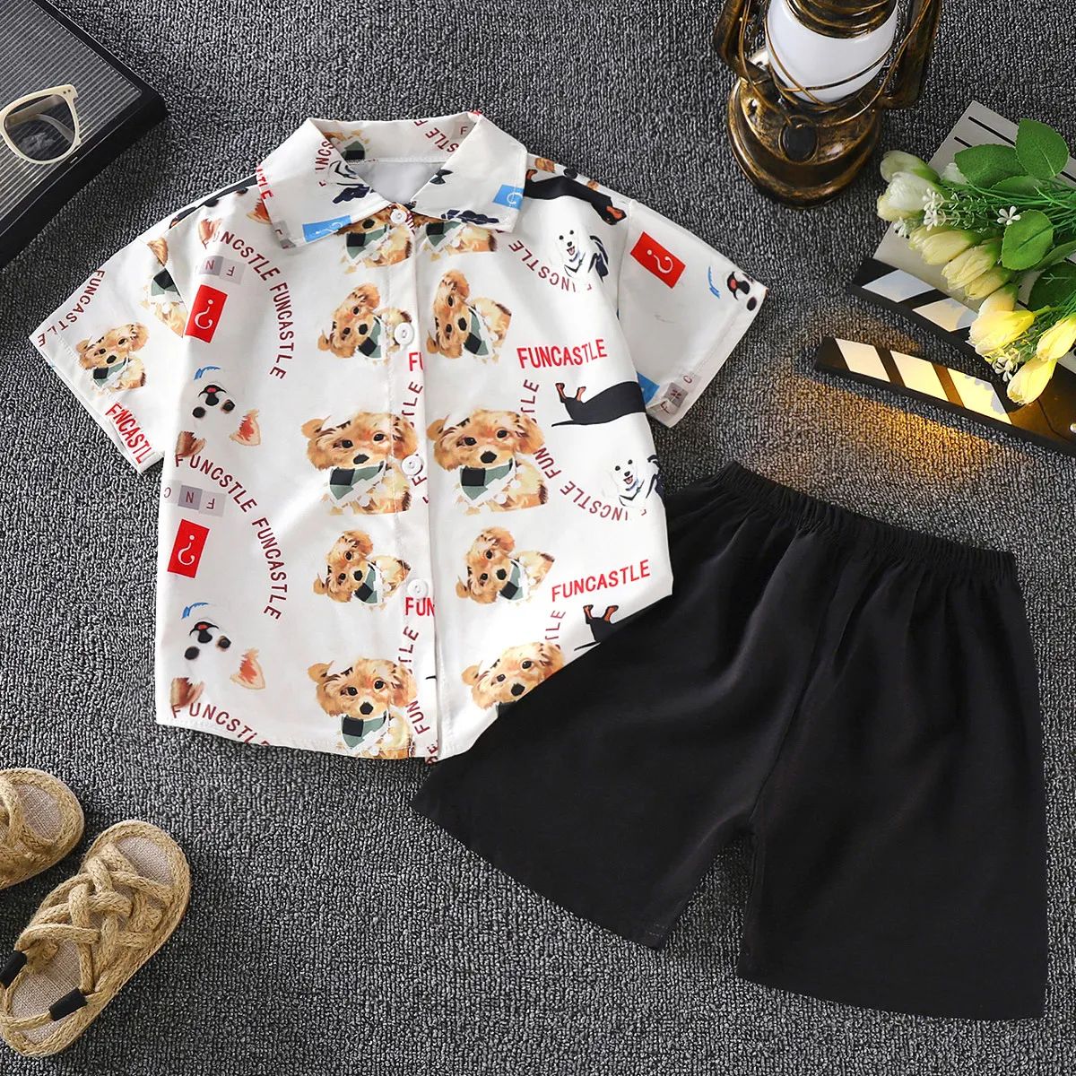 •Color: Camiseta blanca con estampado de perritos; short negro liso.