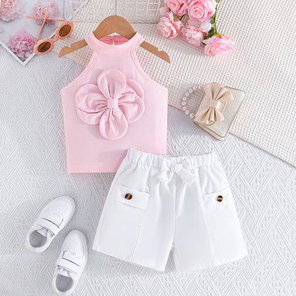 •Color: Blusa rosa con flor decorativa; short blanco.