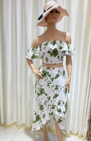 Este conjunto de top con hombros descubiertos y falda a juego forma parte de la nueva colección, ofreciendo un look femenino y fresco. Ideal para climas cálidos y ocasiones informales donde quieras lucir relajada pero con estilo.