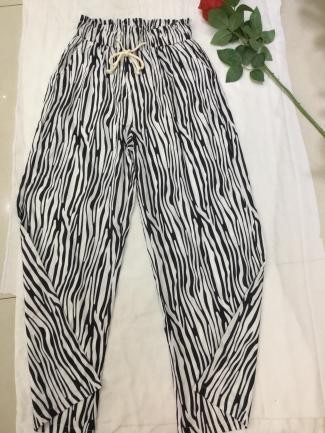 Pantalón estampado con rayas tipo cebra en blanco y negro. Un diseño moderno y versátil que se adapta a looks casuales y urbanos con un toque audaz.