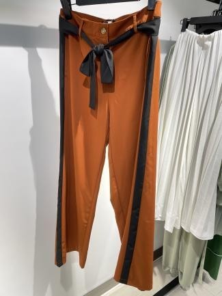 Este pantalón en tono terracota es una prenda llamativa y elegante, realzada por el cinturón tipo lazo negro que acentúa la cintura y estiliza la figura. Perfecto para un look casual chic, ya sea con blusas formales o camisetas básicas para un contraste moderno.