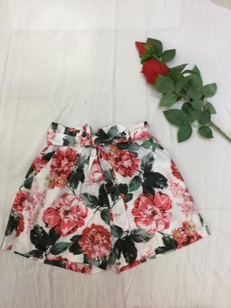 Shorts con base blanca y estampado de flores grandes en tonos rojos y rosas. Una prenda llamativa que aporta frescura y estilo a cualquier outfit veraniego.