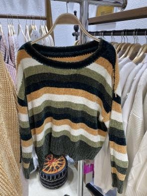 Con franjas horizontales en distintos tonos oscuros y claros, este sweater evoca un estilo retro renovado. Ideal para quienes disfrutan de un look casual con un toque vintage.