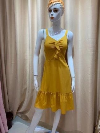 Este vestido amarillo de corte midi transmite energía y frescura. Su diseño con lazo en el pecho y caída suelta lo hace ideal para climas cálidos y looks casuales con estilo.