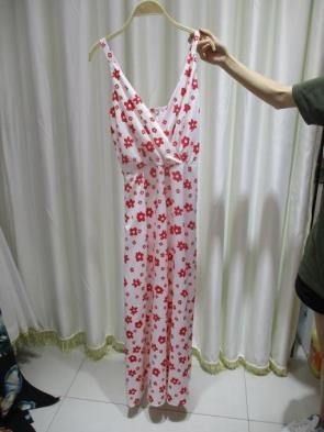 Romántico y femenino, este vestido blanco con estampado floral rojo hace parte de la nueva colección. Su estilo vaporoso lo convierte en la prenda ideal para días soleados, tardes de picnic o eventos al aire libre.