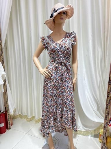 Un vestido largo en tono gris con estampado floral pequeño y mangas cortas abullonadas. Su diseño romántico y femenino lo hace perfecto para un estilo elegante y relajado.